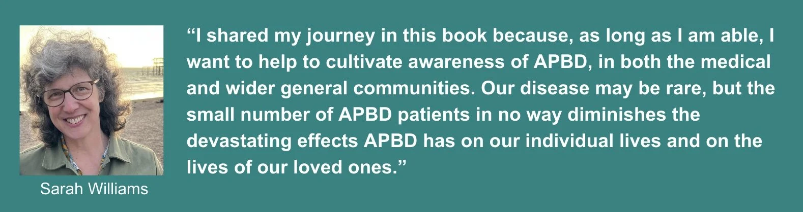 [Editor’s Note: Our thanks to Kerry Wong for featuring Sarah Williams’s APBD narrative in her newly published book, “Kaleidoscope: Rare Disease Stories.” The book is a collection of first-person stories from people around the world living with a variety of rare diseases. Thanks Kerry and Sarah for raising the public profile of APBD and other rare diseases!]